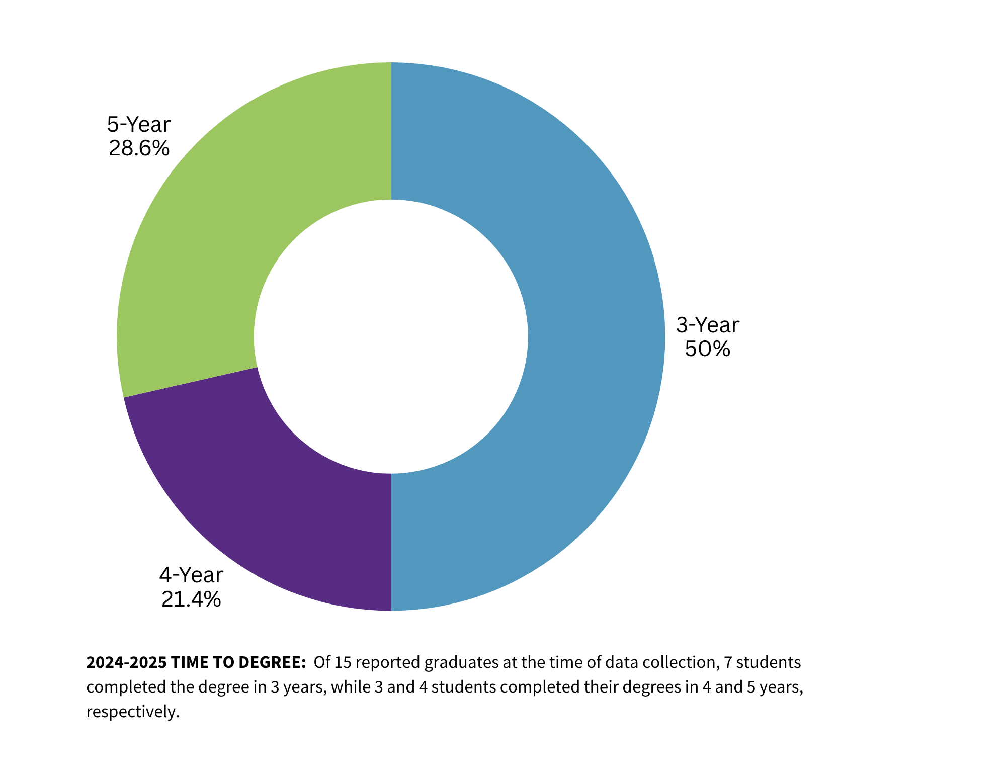 - Of the 12 students, 8% (1 student) completed the degree in three (3) years, 50% (6 students completed the degree in four (4) years, and 42% (5 students) completed the degree in five (5) years.