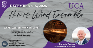 The UCA Bands program includes several ensembles: Wind Ensemble, Symphonic Band, Campus Band, Bear Marching Band, Purple Rage Basketball Band, Studio Jazz Ensemble, and Jazz Repertory Ensemble. These ensembles are composed of undergraduate and graduate students pursuing music degrees and non-majors who wish to continue their musical journey as part of their college experience.