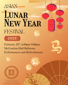The Center for Asian Languages and Cultures at UCA hosted celebration on January 31st, two days after Chinese New Year, with music performance, art, and Chinese food. Over 150 members of UCA and the local Asian community in Conway attended.