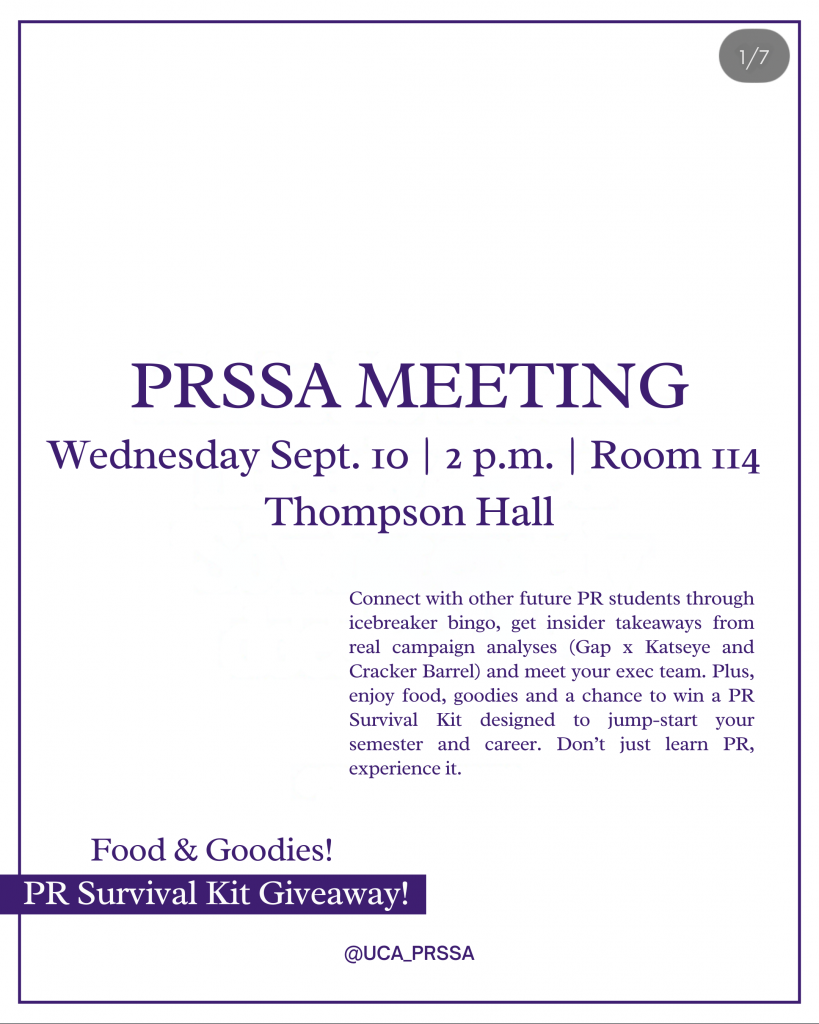 Join us for our first meeting Wednesday, Sept. 10 at 2 p.m. in Thompson Hall Room 114. Connect with other PR students through icebreaker bingo, see campaign breakdowns of Gap x Katseye and Cracker Barrel, and meet your exec team.