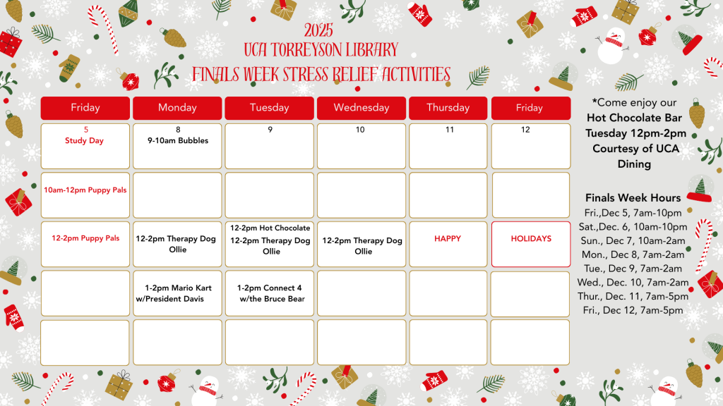 Finals Week is approaching and we have the stress relievers students need to ensure balance and calm. From bubbles and bubble wrap to therapy dogs and more, please check out our calendar and come take advantage of our fun Finals Week programming.