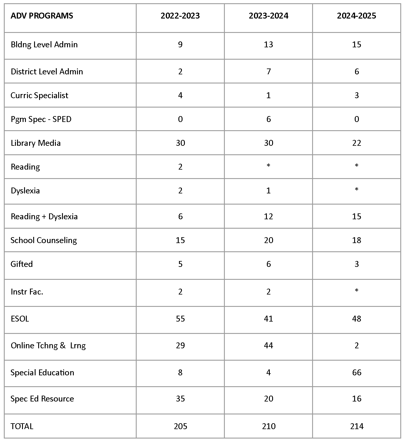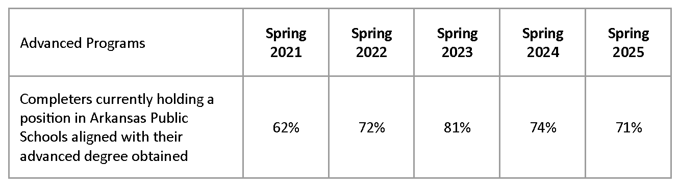 EPP gathers data on initial program completers’ employment and retention milestones in partnership with UCA Office of Institutional Research and in partnership with Arkansas Division of Elementary and Secondary Education. The EPP asks at end of program if each graduating advanced program candidate has acquired a new position aligned with their graduate program of study and/or is now working in a position aligned with their graduate program of study. Each reporting point (e.g., Spring 2025) reflects those completers teaching in APS in a position aligned with their area of licensure as they exit their program. For example, the Spring 2025 data point reflects those AY 24-25 completers working in a position aligned with their advanced program in APS in AY 24-25.