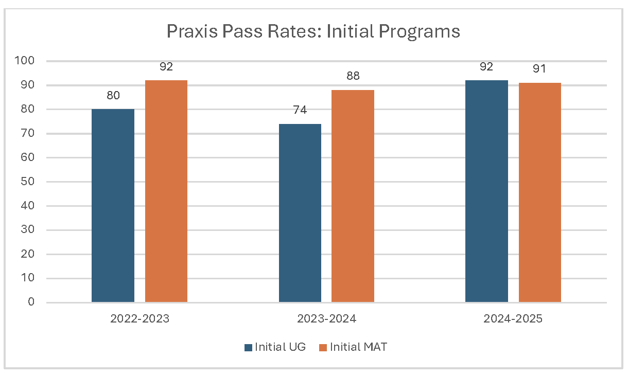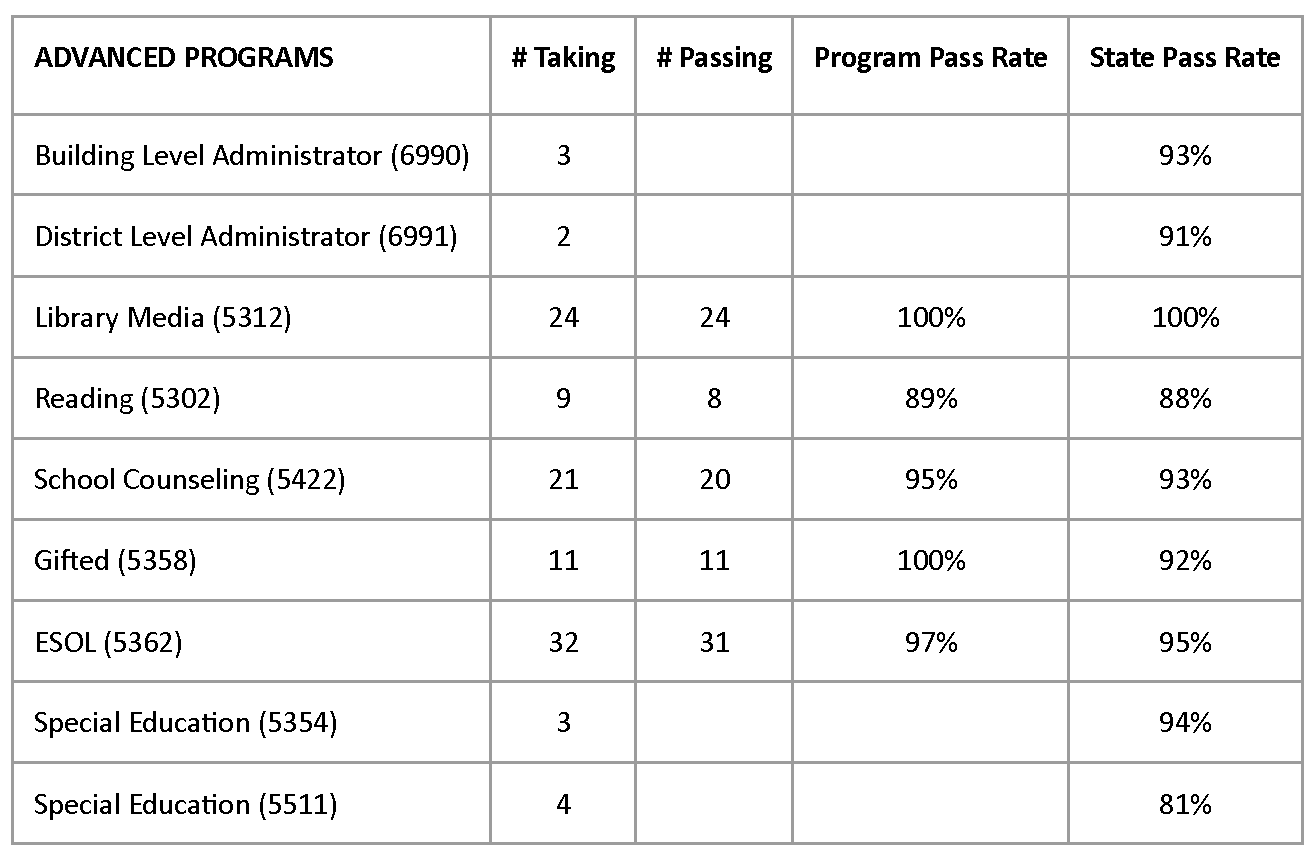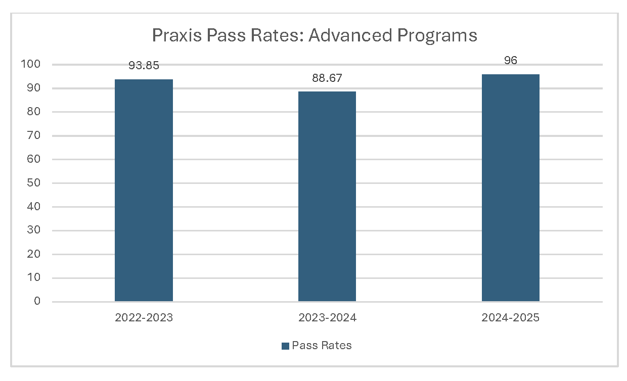 - Both initial and advanced programs report overall success in candidate ability to pass the required Praxis content exam(s) with many programs yielding pass rates at 90% and higher. The EPP has created several support and remediation structures for students struggling to pass their required exam(s) successfully, namely 240 Tutoring.