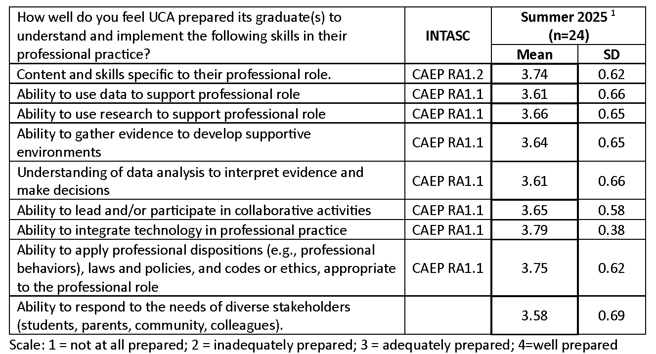 The Advanced Programs Employer Satisfaction Survey is an internal measure used by the EPP to assess employer perceptions of the preparedness and effectiveness of graduates from advanced licensure programs. The survey is administered annually to supervisors of graduates and asks them to rate preparation across competencies aligned with CAEP RA1 expectations using a four-point scale ranging from “not at all prepared” to “well prepared.” This report summarizes the three most recent administrations (Summer 2023–Summer 2025), with results disaggregated by advanced program area. Across these administrations, employers consistently rate UCA graduates between “adequately prepared” and “well prepared,” with particularly strong ratings in areas such as role-specific professional knowledge, the integration of technology in professional practice, and the application of professional dispositions and ethical standards. Employers also report that graduates demonstrate strong capacity to use data, research, and evidence to inform decision-making and to collaborate with colleagues and stakeholders in their professional roles. These findings provide additional evidence of advanced program effectiveness and are used by the EPP to inform program improvement and continuous improvement efforts. Benchmark comparison data are not available because the state does not collect or report comparable employer survey indicators across educator preparation programs.