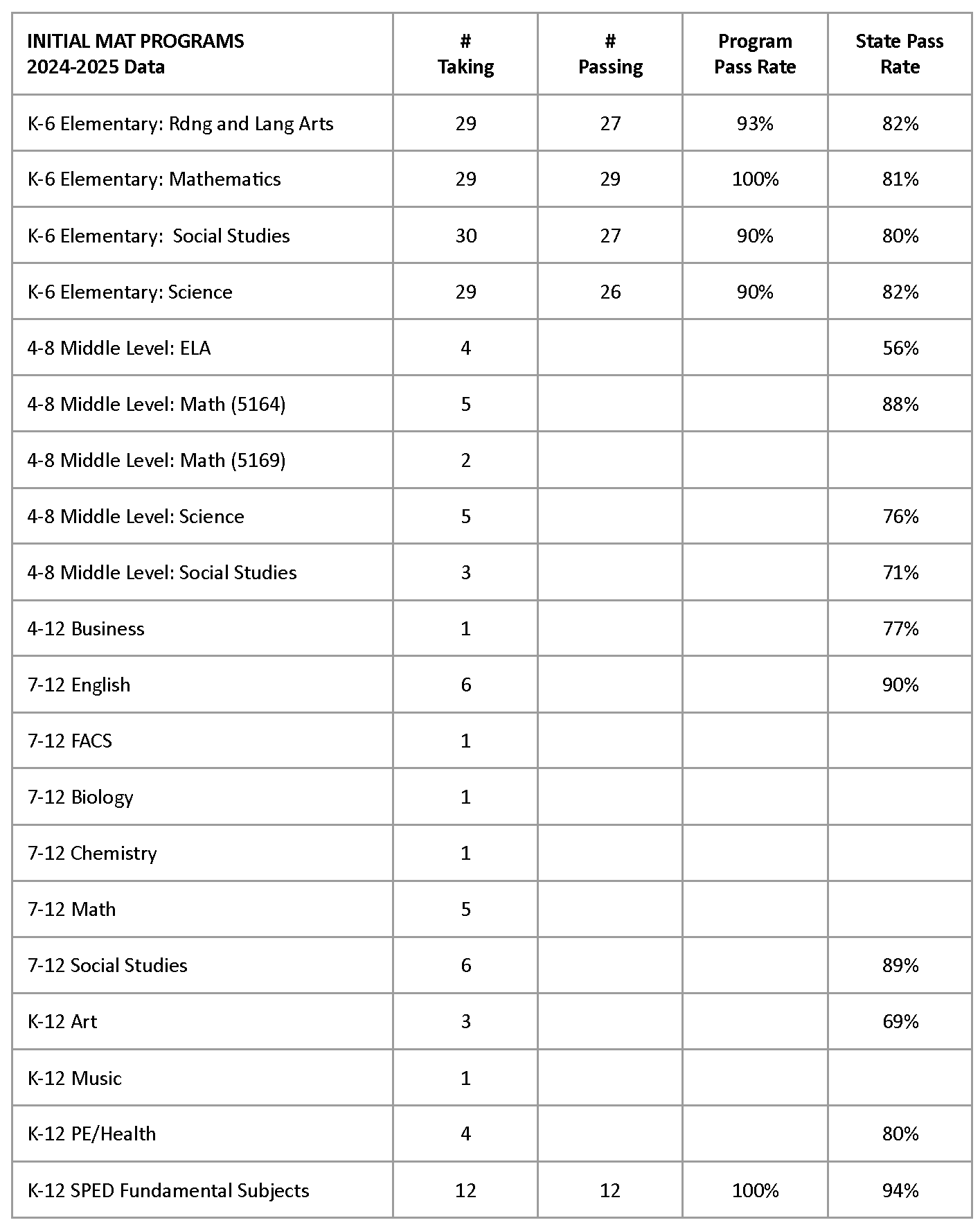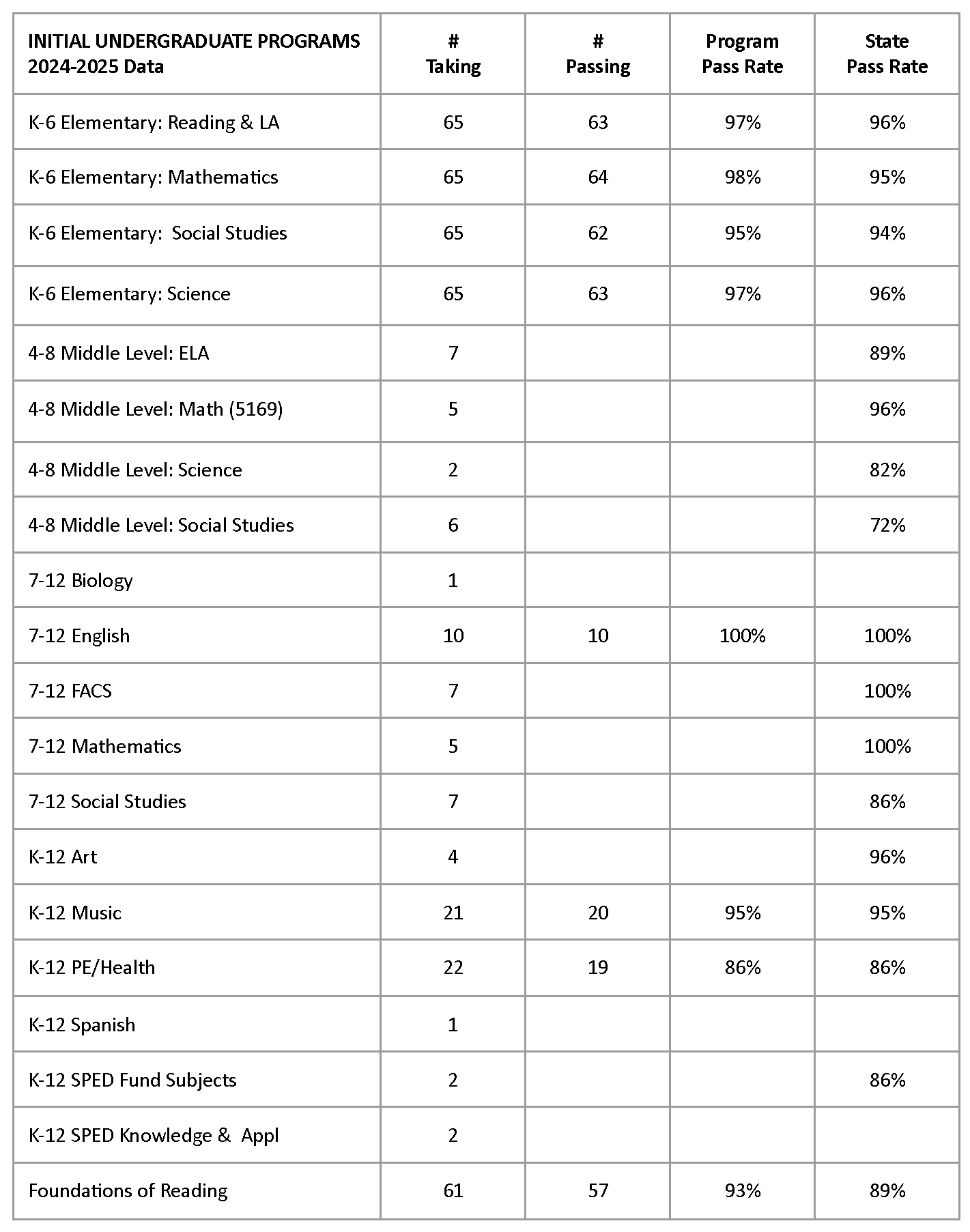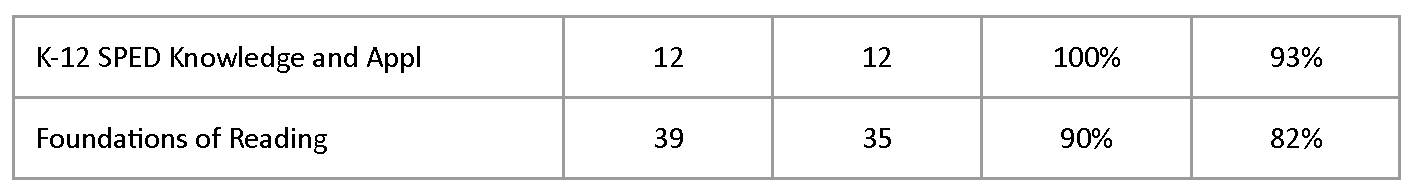 - Both initial and advanced programs report overall success in candidate ability to pass the required Praxis content exam(s) with many programs yielding pass rates at 90% and higher. For initial programs, changes to policy for “Gate 3” (admission to internship 2) have resulted in higher pass rates, notably for the K6 program. Candidates must now meet the ADE/AAP score for admission to Gate 3 (https://uca.edu/ocs/aap-provisional/). Additionally, the EPP has created several support and remediation structures for students struggling to pass their required exam(s) successfully, including: 240 Tutoring, Praxis Boot Camps (DESE grant), and state resources/tutoring programs. Undergraduate K6 Social Studies continues to be an area of focus for continuous improvement.