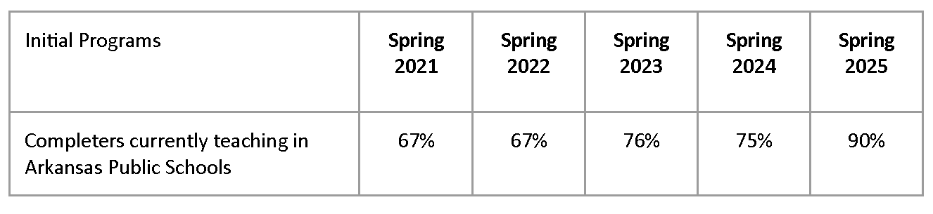 EPP gathers data on initial program completers’ employment and retention milestones in partnership with UCA Office of Institutional Research and in partnership with Arkansas Division of Elementary and Secondary Education. Each reporting point (e.g., Spring 2025) reflects those completers teaching in APS at that point in time based on their completion the prior academic year. For example, the Spring 2026 data point reflects those AY 24-25 completers teaching in APS in AY 25-26. Notably, the data show an increase in the number of completers obtaining employment in Arkansas Public Schools. This may be attributed to the state mandated increase in starting teacher salary statewide.