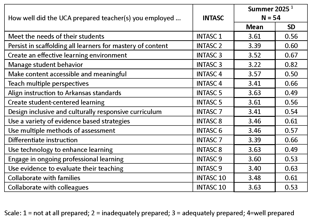 The Initial Programs Employer Survey is an internal measure used by the EPP to assess employer perceptions of the preparedness and effectiveness of UCA program completers during their first year of teaching. The survey is administered annually to school administrators who supervise recent completers and asks them to rate preparation across competencies aligned with the InTASC standards using a four-point scale ranging from “not at all prepared” to “well prepared.” This report summarizes the three most recent administrations (Summer 2023–Summer 2025), with results disaggregated by program. Employers consistently rate UCA completers between “adequately prepared” and “well prepared” across most domains, with particularly strong ratings in areas such as meeting student needs, aligning instruction to Arkansas standards, collaborating with colleagues, and integrating technology into instruction. Employers also indicate that completers are generally prepared to support diverse student populations, including students of color, students in poverty, and students with special needs, though slightly lower ratings appear in areas such as classroom management and supporting English Language Learners. These findings provide additional evidence of completer effectiveness and are used by the EPP to triangulate state employer survey results and inform program improvement efforts. Benchmark comparison data are not available because the state does not collect or report comparable employer survey indicators across educator preparation programs beyond those included in Measure 1b.