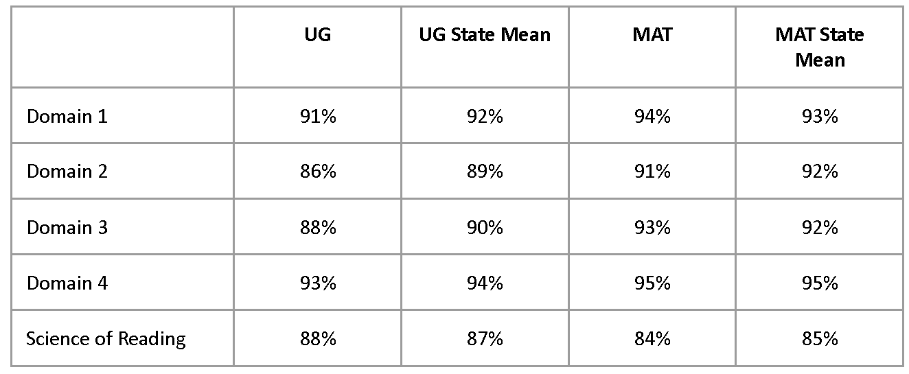 - Opportunities for targeted improvement. Slightly lower ratings in Domain 2 for both UG and MAT programs suggest potential areas for program refinement, while Science of Reading preparation is rated slightly above the state mean for undergraduates but slightly below for MAT completers, warranting continued attention as SoR expectations evolve.