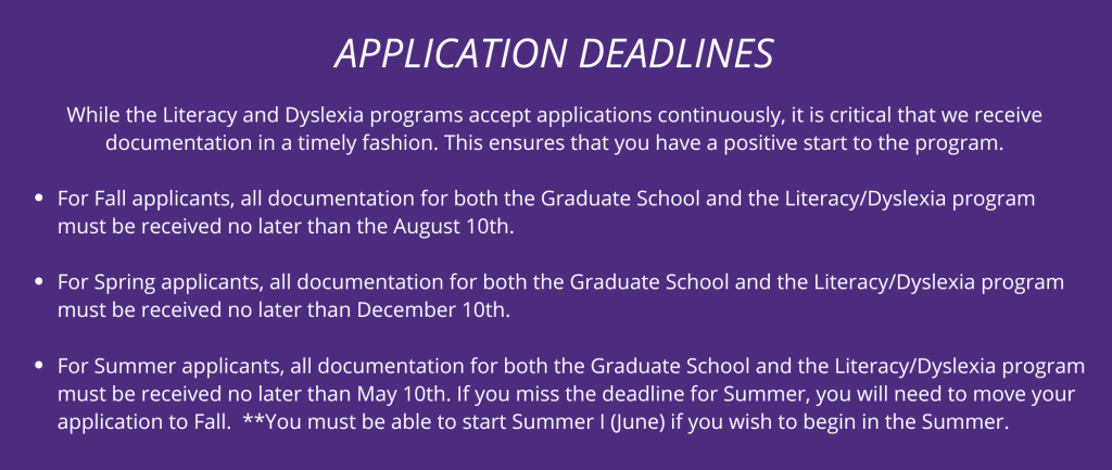 The M.S.E. in Literacy with a Dyslexia Endorsement is a 100% online program, delivered through a primarily asynchronous format. Questions regarding the program, and/or application process, can be directed to the program coordinator.
