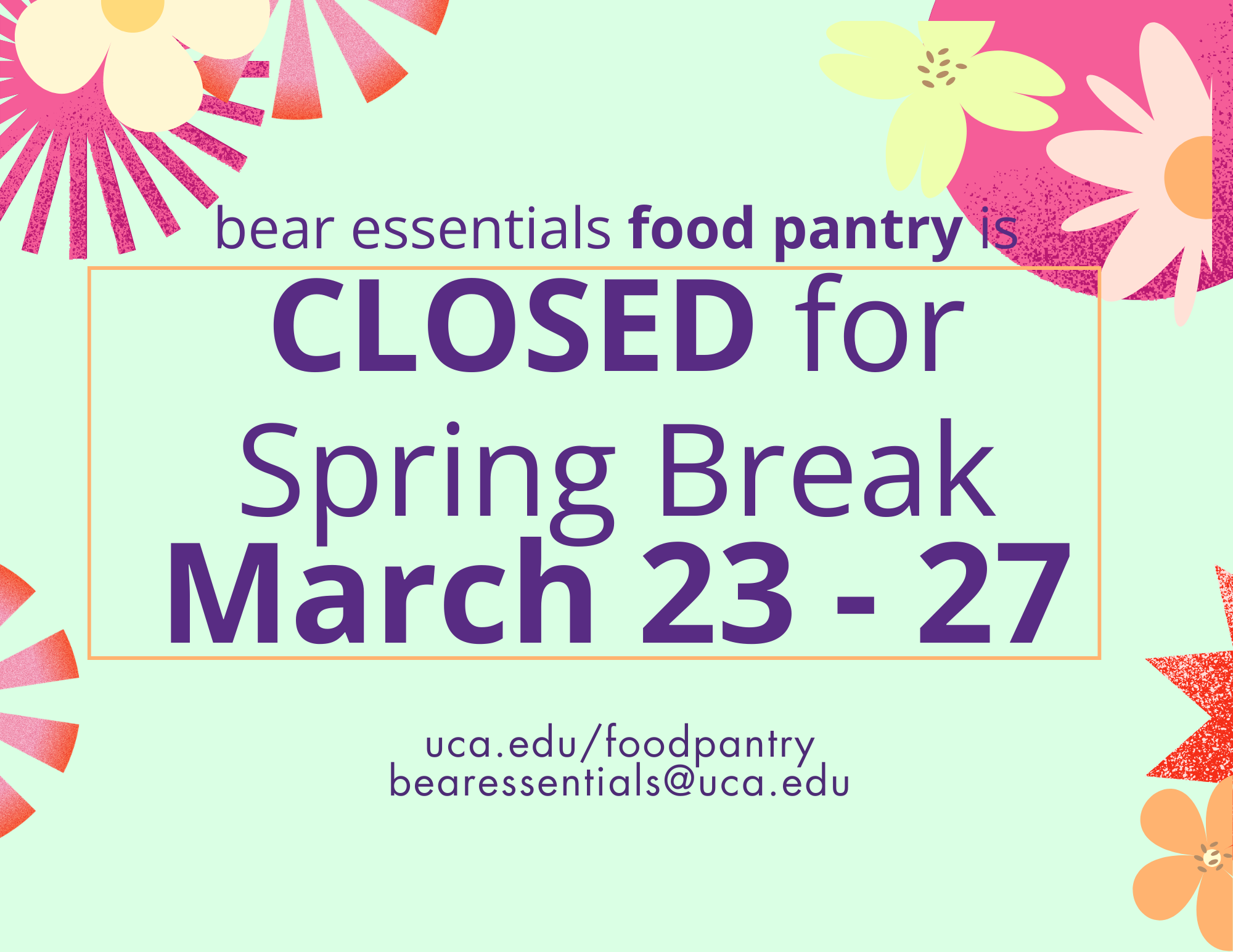 The Bear Essentials Food Pantry will be closed for UCA’s Spring Break from Monday, March 23 through Friday, March 27. We will reopen at 11 am on Monday, March 30.
