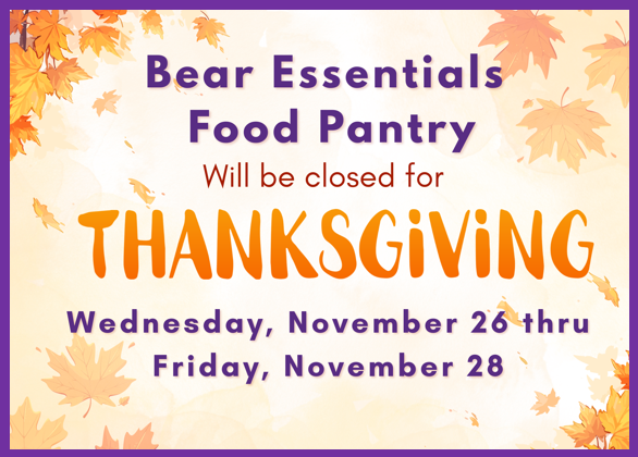 The Bear Essentials Food Pantry will be closed for the Thanksgiving holiday from November 26 through November 28. We will reopen at 11 am on Monday, December 1.