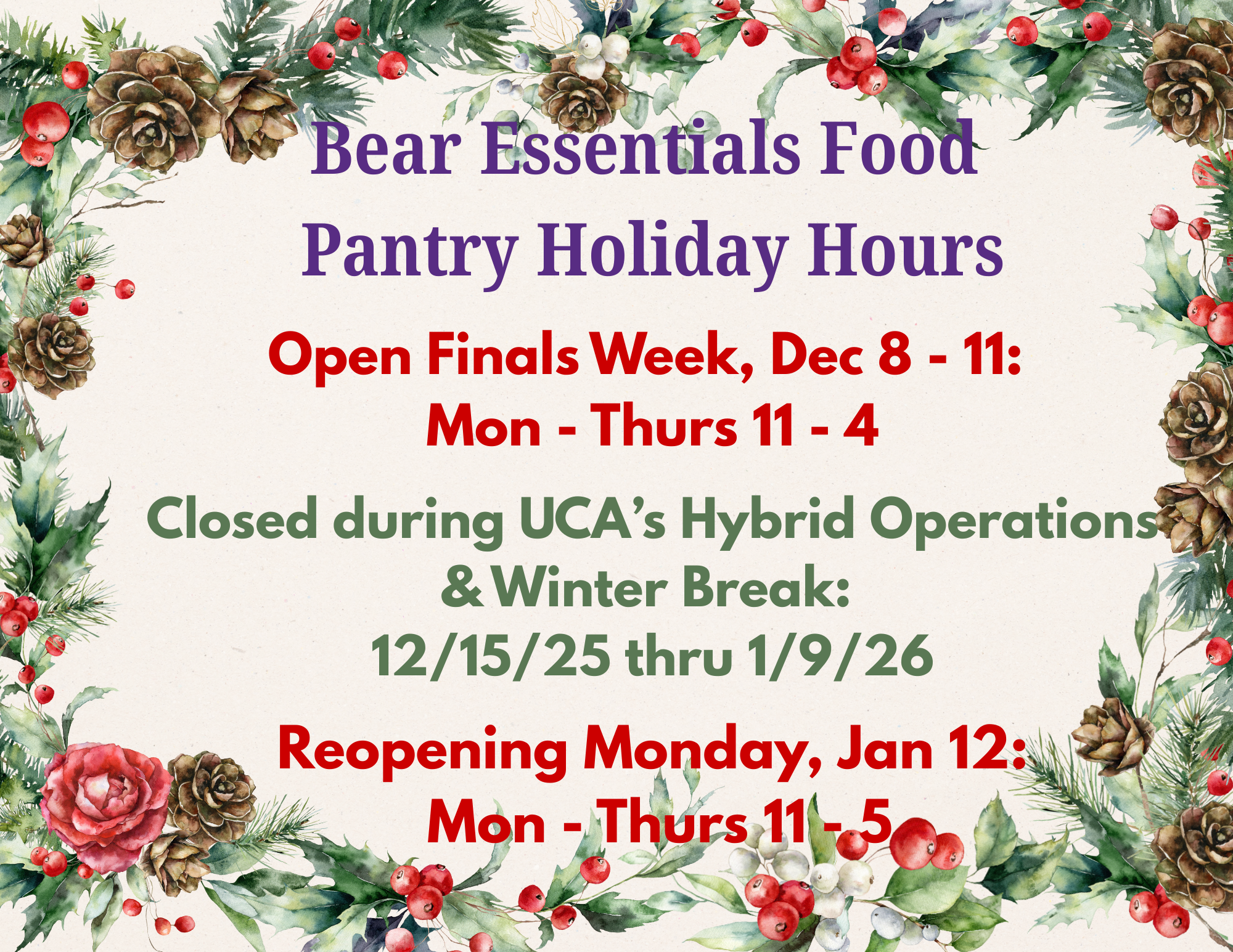 The Bear Essentials Food Pantry will be open Finals Week from 11 am – 4 pm. During UCA’s hybrid operations and Winter Break, the Pantry will be closed 12/15/25 – 1/9/26. Before the Spring Semester begins, the Food Pantry will undergo cleaning and restocking the week of 1/5 – 1/9/26.