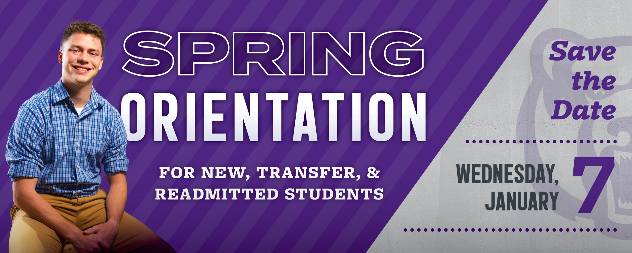 For new students and readmitted students starting in the spring, we host a New Student Orientation program the day before instructions begins. For spring 2026, the date is Wednesday, January 7th in the Student Center Ballroom. Please plan to arrive between 9:30-10:00 am to check-in.