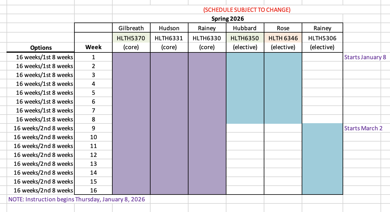 Courses highlighted in blue are electives. Courses highlighted in purple are core courses. Students should keep all textbooks and materials for core courses to study for the Exit Exam &/or CHES/MCHES exams.