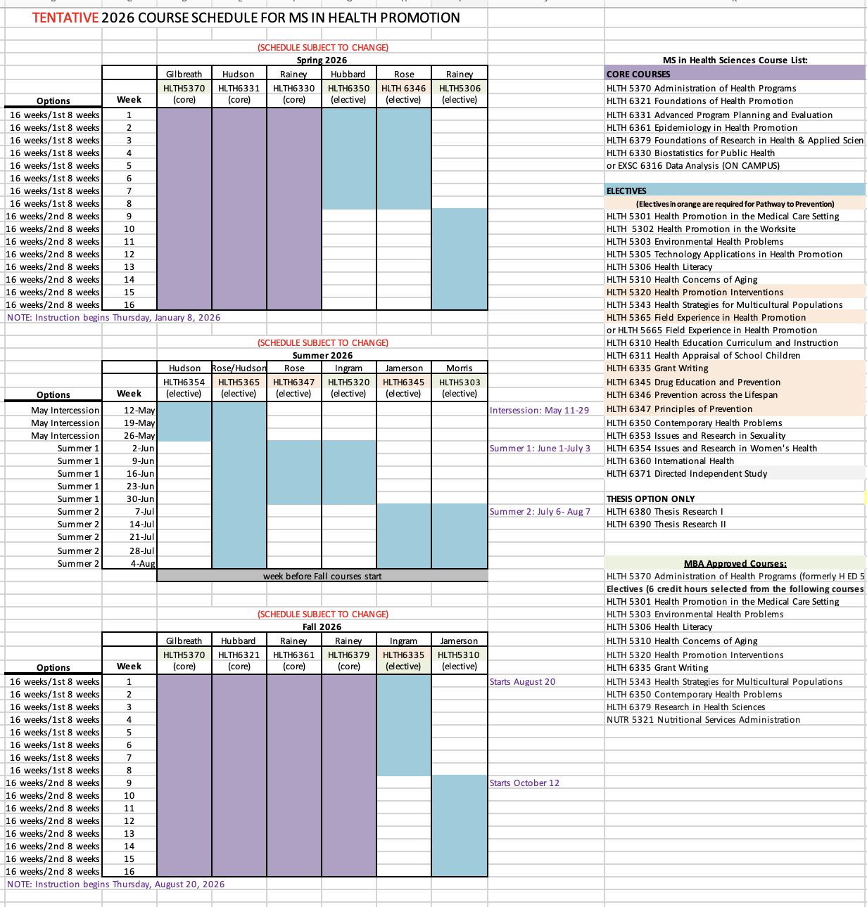 Tentative 2026 course schedule for MS in Health Promotion: