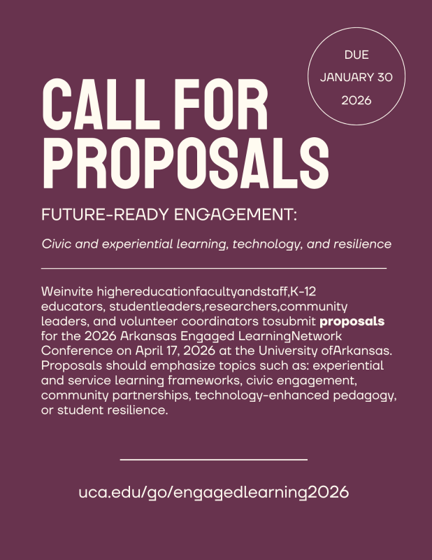 The Arkansas Engaged Learning Network invites K-16 educators, student leaders, researchers, community leaders, and volunteer coordinators to submit proposals for the 2026 Engaged Arkansas Conference. Our theme is Future-Ready Engagement: Civic and Experiential Learning, Technology, and Resilience, and the call for proposals (proposals due January 30th) is available at uca.edu/go/engagedlearning2026. Please help spread the word to the community-engaged K-16 educators and student leaders in your networks, as well as community contacts who partner with K-16 institutions on community-engaged projects!