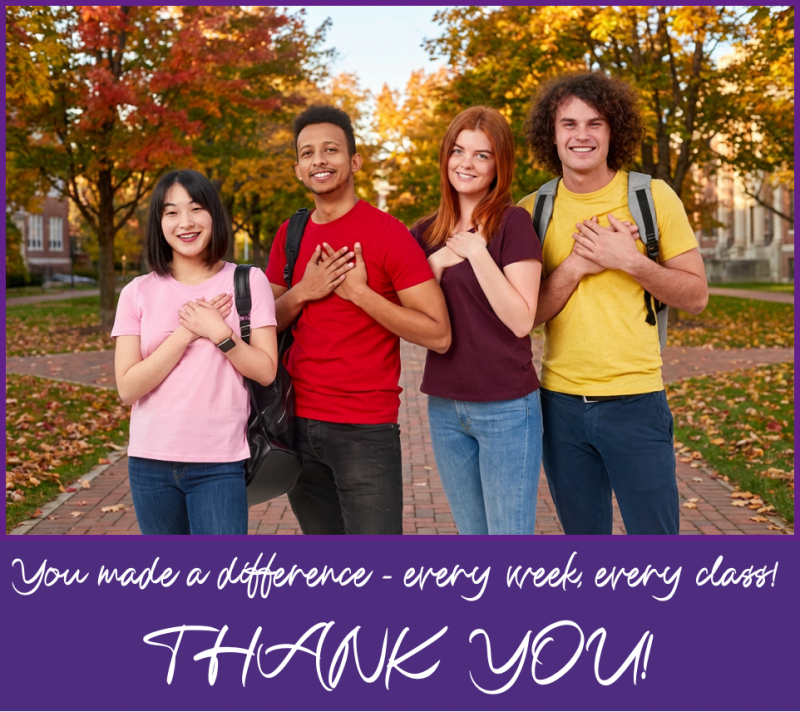 Ah, Week 15 — when syllabi are checked like treasure maps and calculators become emotional support objects. All semester, you’ve helped students feel capable, connected, and confident. Whether you implemented every strategy or just a few that resonated with you, your impact has been real and meaningful. Thank you for sticking with us and cheering students toward the finish line!