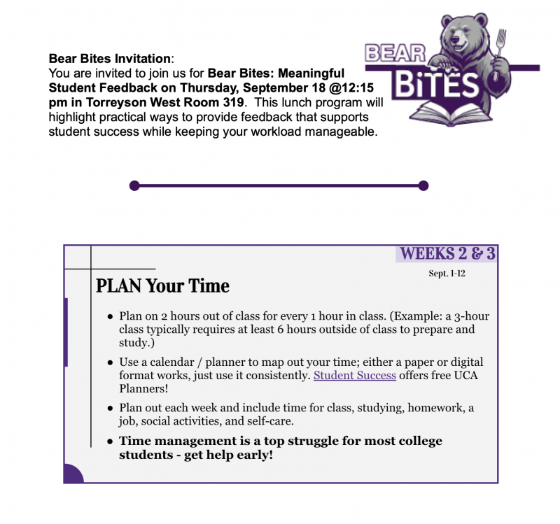 You are invited to join us for lunch! Bear Bites: Meaningful Student Feedback, on Thursday, September 18, at 12:15 p.m. in Torreyson West 319.