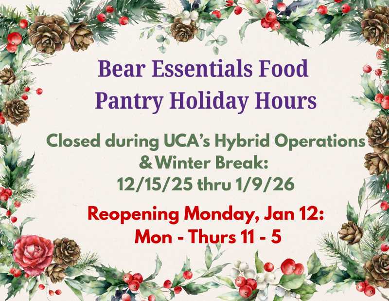 During UCA’s hybrid operations and Winter Break, the Bear Essentials Food Pantry will be closed 12/15/25 – 1/9/26. Before the Spring Semester begins, the Food Pantry will undergo cleaning and restocking the week of 1/5 – 1/9/26.