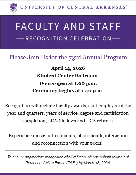 Recognition will include faculty awards, staff employee of the year and quarters, years of service, degree & certification completion, LEAD fellows, and UCA retirees.