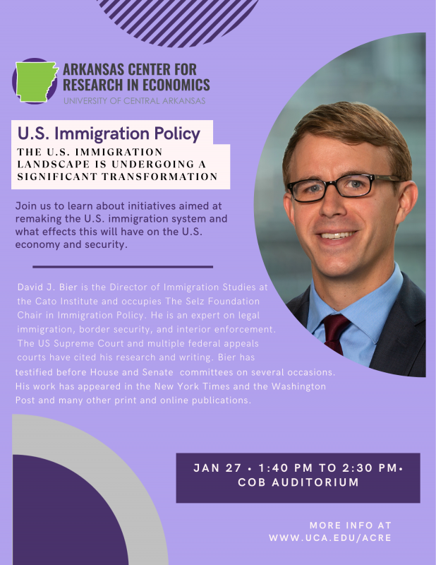 The Arkansas Center for Research in Economics (ACRE) welcomes Dr. David J. Bier, the Director of Immigration Studies at the Cato Institute, to speak on U.S. Immigration policy. Join us on Tuesday, January 27, 2026, at 1:40 p.m. (x-period) in the COB auditorium to learn about initiatives aimed at remaking the U.S. immigration system and what effects this will have on the U.S. economy and security.