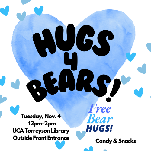 Are you stressed or homesick leading up to Finals Week? Need a hug, fist bump or just a few words of encouragement? We’re giving hugs, fist bumps, candy and snacks at our Hugs 4 Bears event Tuesday, November 4, 12pm-2pm outside UCA Torreyson Library’s front entrance. Leave notes of encouragement for others on our WordHugs affirmation board. We hope to see everyone there!