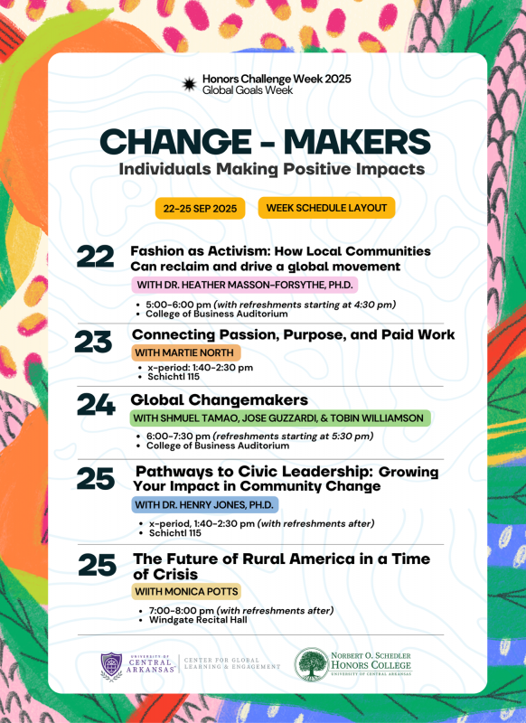 This year, the Honors College and the Center for Global Learning and Engagement are partnering to highlight the UN Global Goals as part of a global celebration to promote awareness of the 17 UN Sustainable Development Goals (SDGs) during Global Goals Week. Our goal is to inspire our community with diverse examples of people making positive SDG impacts in their community through grassroots efforts, from the inside of organizations, through their profession, or all three. Each speaker will offer a different model for how to not only make ends meet after graduation, but live a meaningful, impactful life.