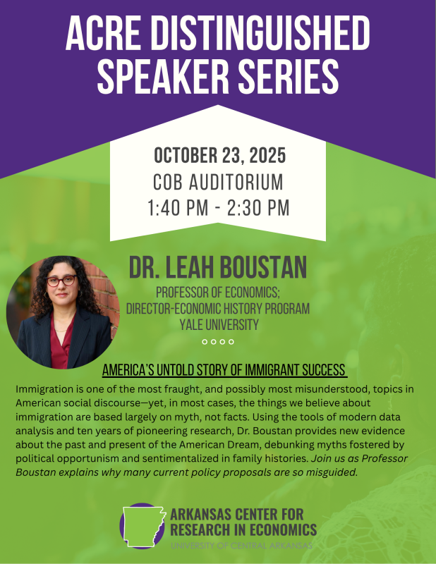 ACRE Distinguished Speaker Series presents Yale University Economics Professor, Dr. Leah Boustan, to speak on immigration and the American Dream, Thursday, October 23rd during x-period in the College of Business Auditorium.