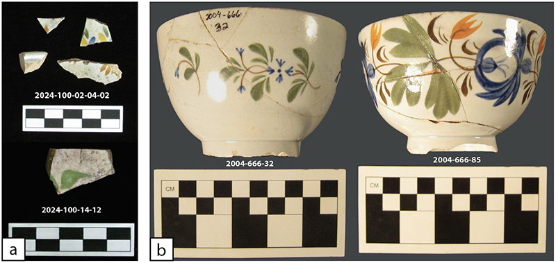 Figure 6. (a) Decorated polychrome pearlware recovered from Area A. 2024-100-02-04-02 was recovered from Unit 25 (0-10cm) and 2024-100-14-12 was recovered from Unit 26 (0-10cm). (b) Reconstructed teacups recovered by the Arkansas Archeological Survey during 2004 excavations.