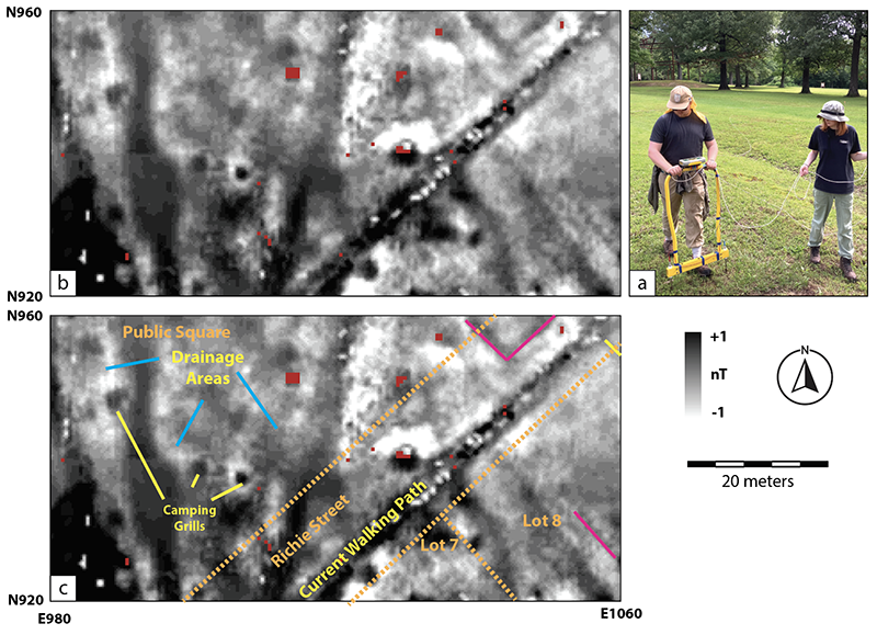 At Davidsonville, eight 20 x 20-meter grids were established south of the area previously collected by the Arkansas Archeological Survey and within portions of the Public Square (see Figure 1). Electrical resistivity was collected with spacing between transects (Y) and along the baselines (X) each set to half-meter spacing. Current (I) ranges were set to 1 mA at an output voltage (V) of 40 V allowing for a resolution of 0.0005 ohms. Data were collected by zigzag (collecting while walking back and forth) using an RM Frobisher TAR-3 resistance meter (Figure 2a).