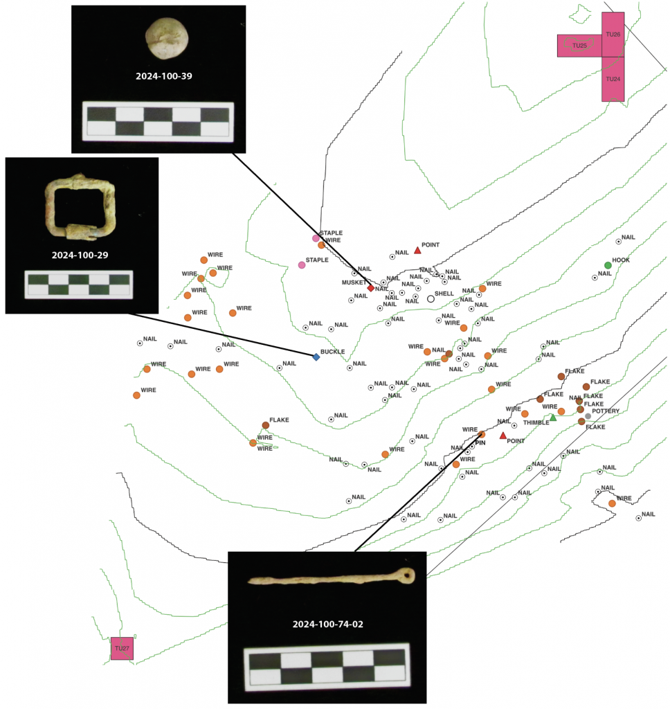 Figure 4. Results from metal detecting survey with several important artifact illustrated.