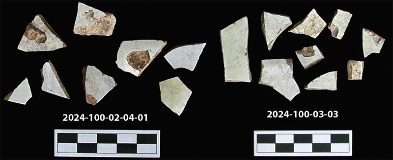 Figure 5. “Plain” pearlware recovered from Area A. 2024-100-02-04-01 was recovered from Unit 25 (0-10cm) and 2024-100-03-03 was recovered from Unit 26 (0-10cm).