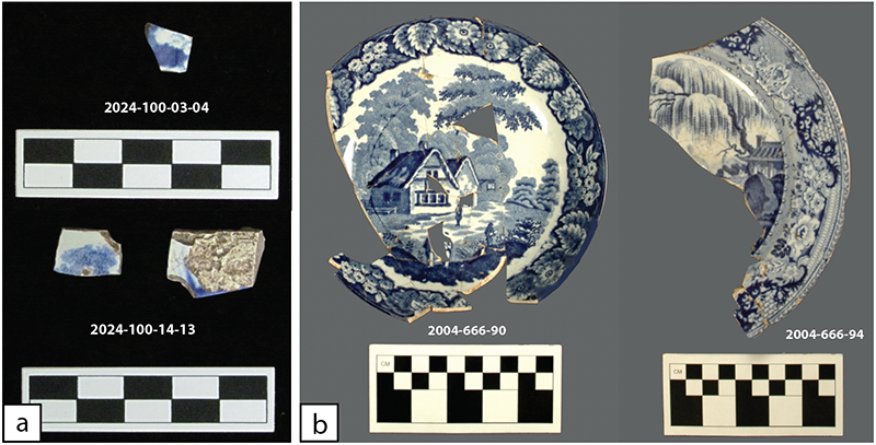 Figure 7. (a) Decorated blue transfer-print pearlware recovered from Area A. 2024-100-02-03-04 was recovered from Unit 26 (0-10cm) and 2024-100-14-12 was recovered from Unit 26 (10-20cm). (b) Reconstructed plates recovered by the Arkansas Archeological Survey during 2004 excavations.