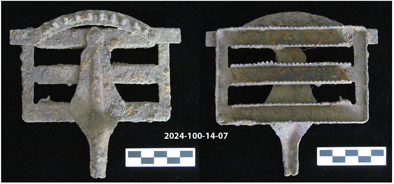 In terms of research questions and the identification of the former cotton gin, or related features, excavation results do not document the remains of architectural features. They remain elusive. However, an abundance of nails suggest buildings or constructed features (fencing, perhaps) were present in the area tested. An analysis of nails was not conducted as part of this report, which could further define the temporal aspect in Lots 4 and 5 (see Adams 2002; Wells 1998). In short, items recovered provide a simple confirmation that the Lots 4 and 5 landscape was utilized in the late nineteenth and mid-twentieth centuries. Only a single artifact sheds light on the types of past activities undertaken in the tested area. Within Unit 26 a metal curry comb (2024-100-14-07) was recovered from Level II (Figure 8). The comb resembles a James Carpenter “333” pattern which dates to the late nineteenth and mid-twentieth centuries (Knopp 2011). During the occupation of Davidsonville, cotton production required the use of horse drawn power to operate both the cotton gin as well as the cotton press (Aiken 1973; Bennett 1960).