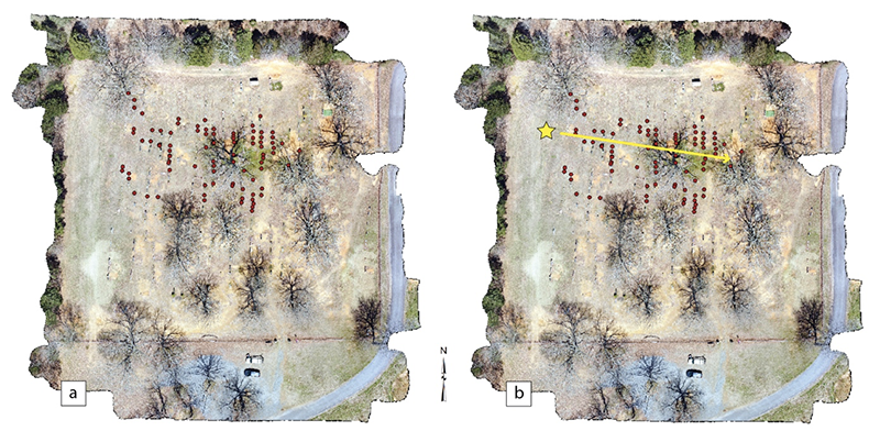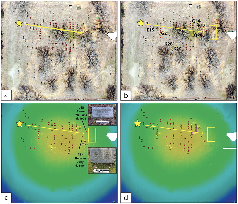 To evaluate the possible location of the former chapel, a GIS was used to “remove” all burials that post-date April 1917 and to evaluate burial patterns to consider our second research question: Can the removal of later burials (post-chapel) shed light on the position of the chapel? At total of 87 marked burials (where death dates are known) represent individuals that were buried before April 1917 (Figure 11a). The burials are concentrated within the central portion of the cemetery and to the northwestern corner. Based on the presence of the landscape ridge, it is interpreted that the photographer in the historic photo is in the northwest corner of the cemetery and individuals are facing to the west-northwest (Figure 11b).