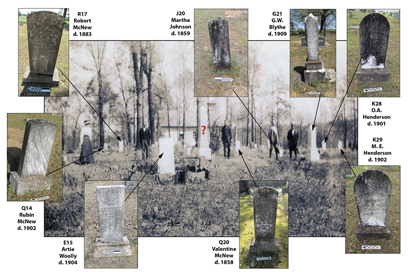 A related question concerns the possible identification of stones visible in the 1917 photograph with current visible stones on the surface today. Based on a field evaluation, proposed positioning of the photographer, and a comparison of stones visible in the 1917 photograph with similar styles of stones and placement at the cemetery today, the identification of a several burial locations are proposed (Figure 12). The medium stone in the foreground is interpreted as the location of E15, Artie Woolly (d. 1904), based on its very regular rectangular shape without a curved top. It is the only stone of this shape in this location today. Using E15 to orientate, several additional stones, with their distinctive shape and relative proximity to each other, nicely align with those in the historic photograph. For example, the medium sized obelisk of G21, G.W. Blythe (d. 1909) and the location and distinctive curved shape of K28 (D.A. Henderson, d. 1901) and K29 (M.E. Henderson, D. 1902). Valentine McNew (d. 1858) is located at the highest elevation in the center of the cemetery, as noted in local lore (see above).