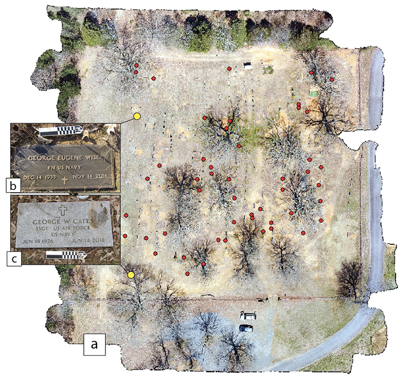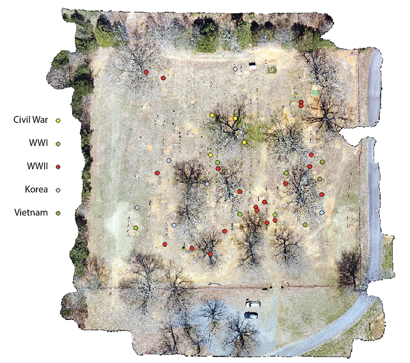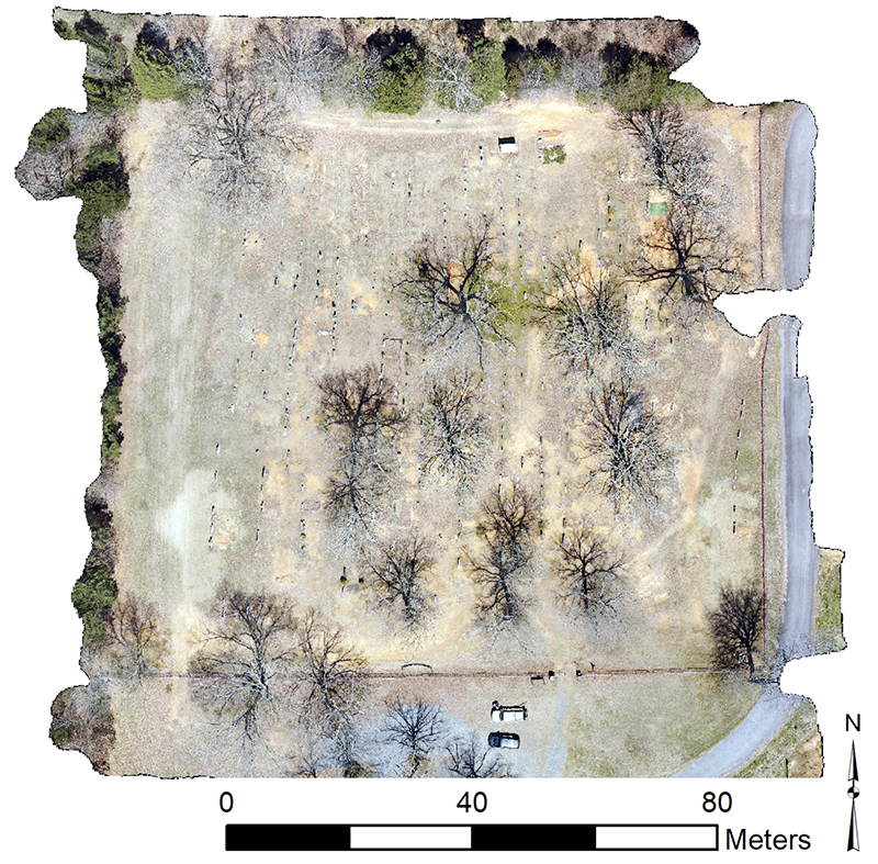 A low-altitude drone image was collected during leaf-off, which serves as the primary spatial dataset (Figure 3). The drone image was imported into a GIS in order to correlate visible burial features in a high-resolution image with those mapped on the surface using a total station. Visible in the image is a vehicle access path that surrounds the burial area. A local paved road is to the south (McNew Cemetery Road) and curves around the cemetery in the southeast corner. The cemetery is bounded by undeveloped property to the west and north and the gated entrance is to the south.