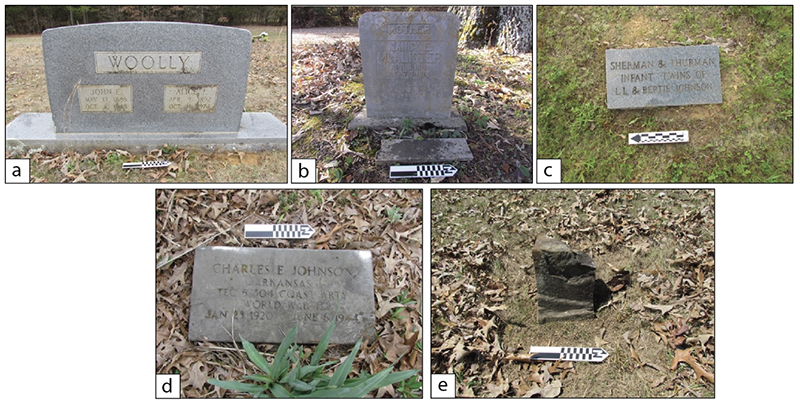 Figure 4. Types of stones prominent at McNew Cemetery include (a) double stones, (b) single upright stones, (c) non-military ground stones, (d) military ground stones, and (e) unmarked sandstones.