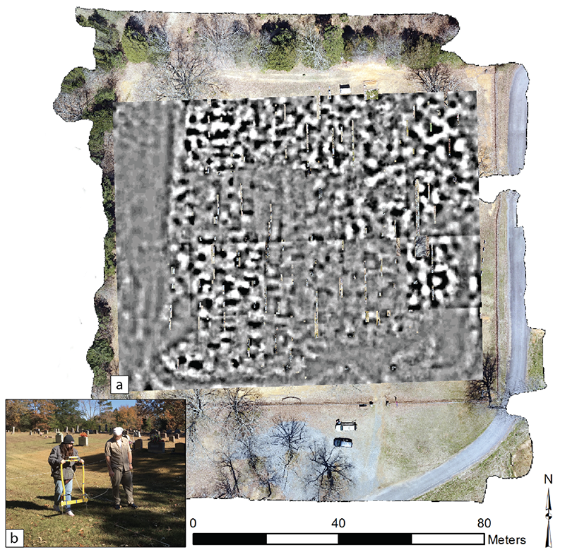Board and community members provided insight that generated three research questions. The first question relates to the use of electrical resistivity to map the sub-surface and evaluate locations marked as “unknown” burial. Are there resistivity anomalies that likely indicate the presence of unmarked burials in these locations? A second question concerns the possible location of the original chapel and its relationship to contemporary burials. Can the “removal” of later burials (post-chapel) shed light on the position of the chapel? Related, can the stones in an historic (ca. 1917) photo be assigned to current visible stones? The third question is associated with the creation of a Geographic Information System (GIS) database and the availability of KMZ (Google Earth) files to the public. How will the integration of multiple datasets allow for research related to demographics, history, and land use within this space, and to be applied to subsequent cemetery surveys? A discussion of each of these research questions is outlined below.
