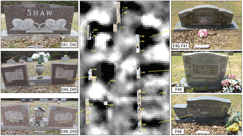 Resistivity survey reveals clear patterns that define the relationship of resistance anomalies to visible surface stones associated with more recent burials. For example, Rows D, E, and F contain more recent burials where resistivity anomalies are likely associated with the presence of modern funerary caskets and the use of mechanized means of digging and backfilling (Figure 6). Results reveal several low resistance (high conductivity) responses (black) that represent a burial pit where moisture has accumulated into a more porous soil matrix. In short, compact soil that was removed to dig the burial has been redeposited over a burial casket as a loose soil matrix that is different from the surrounding compact undisturbed soil. Thus, the loose soil matrix has a different rate of water absorption and is more conductive and lower in resistance that the surrounding soil.