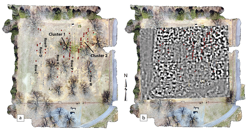 A similar pattern exists in the Cluster 2 area to the northeast. Burials with visible surface stones are clearly identified in the resistivity data, whereas many of the unmarked NO_STONE locations are much more homogenous to the surrounding soil matrix (Figure 9). In addition, two low resistance anomalies are visible north of Rows R and S that do not correspond to a NO_STONE designation and may represent two undocumented burials in this area. They are in alignment with the Row R known burials and are of similar size when compared to known burials. Additional research is necessary to evaluate if these anomalies are natural, such as the remains of former trees, or if these are indeed undocumented burials.
