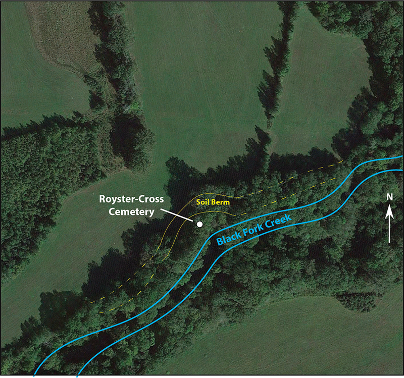 Black Fork Creek is directly to the south of the cemetery and where the landform drops significantly to the creek bed (Figure 3). The cemetery is in a heavily overgrown area and not visible from the adjoining pasture, although it is only around 20 feet within the tree line. A large soil ridge or berm about two feet in height bounds the cemetery on the west and north (see Figure 3). The soil ridge was not tested, and only followed for a few meters beyond the survey area as it follows along Black Fork Creek. It could represent a constructed low-height levee to protect the adjoining pasture or naturally deposited from water lain flood deposits. Current landowners stated that this area floods regularly during wet seasons.