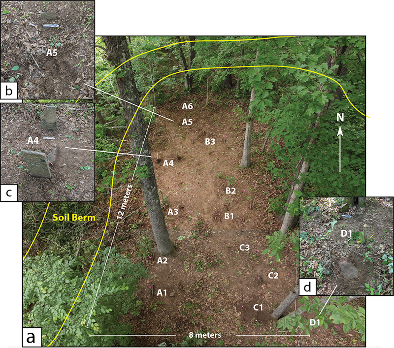For this project, field work consisted of clearing and identifying surface features, collecting subsurface electrical resistivity data, feature mapping, and collection of low-altitude drone imagery. After clearing a small area (12m x 8m), visible stones were organized into four burial rows (A-D) with burials oriented east-west (Figure 4a). Sixteen visible sandstone markers were documented. Headstone and footstone markers are positioned upright, but contain no markings or inscriptions. Many stones have been partially (or mostly) buried by flood deposits (Figure 4b). A single burial (A4) contains a visible surface stone that probably represents a coverstone (Figure 4c). Two burials (C1, D1) have flat stones that are buried just below the surface and may represent coverstones, or fallen headstone or footstones (Figure 4d). Additional coverstones are also likely present with other burials based on preliminary probing with chaining pins. Also documented are three surface depressions indicative of unmarked burials (A3, B2, C3). The surface depressions align with marked burials and are recorded as possible burial locations. Taken as whole, thirteen possible burials were documented within the survey area. Based on spacing between visible headstone to footstones, many of the burials likely represent infant or adolescent individuals. Additional stones may be present outside the survey area in the leaf litter, buried beneath water lain deposits, or as unmarked burial depressions.