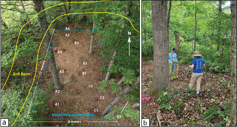 Figure 5. (a) Electrical resistivity survey area. (b) Students collecting resistivity data in the cleared area.